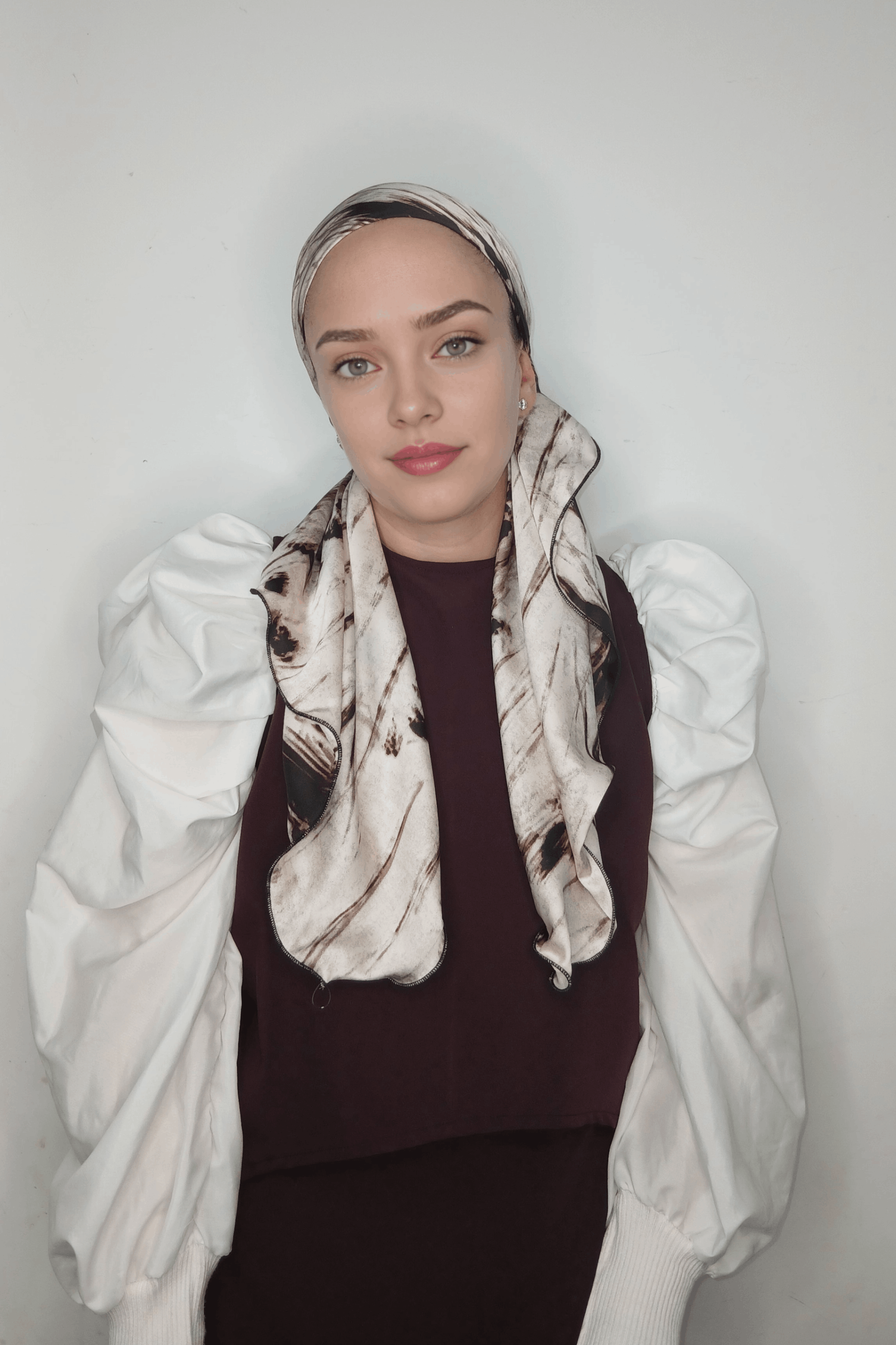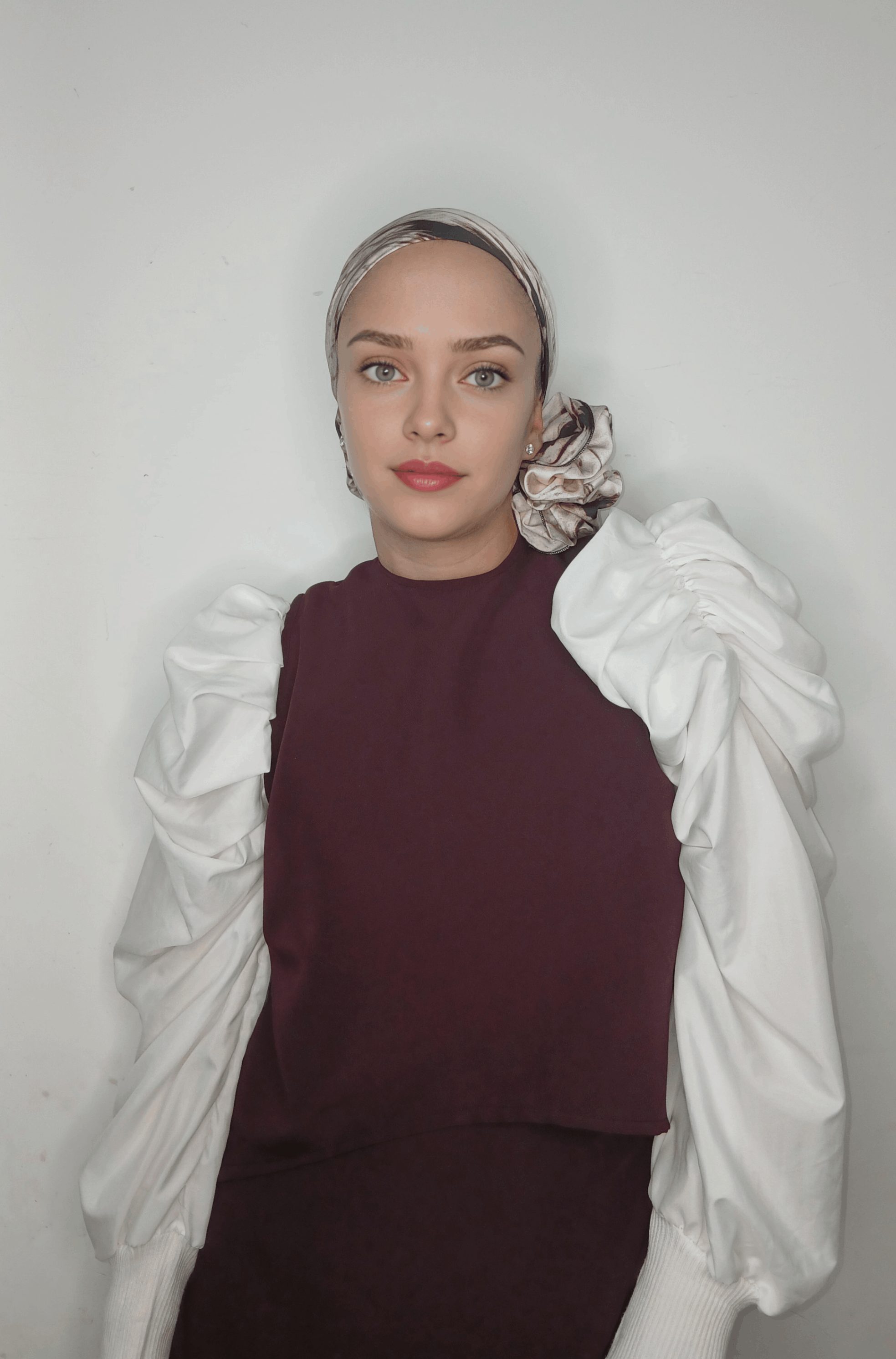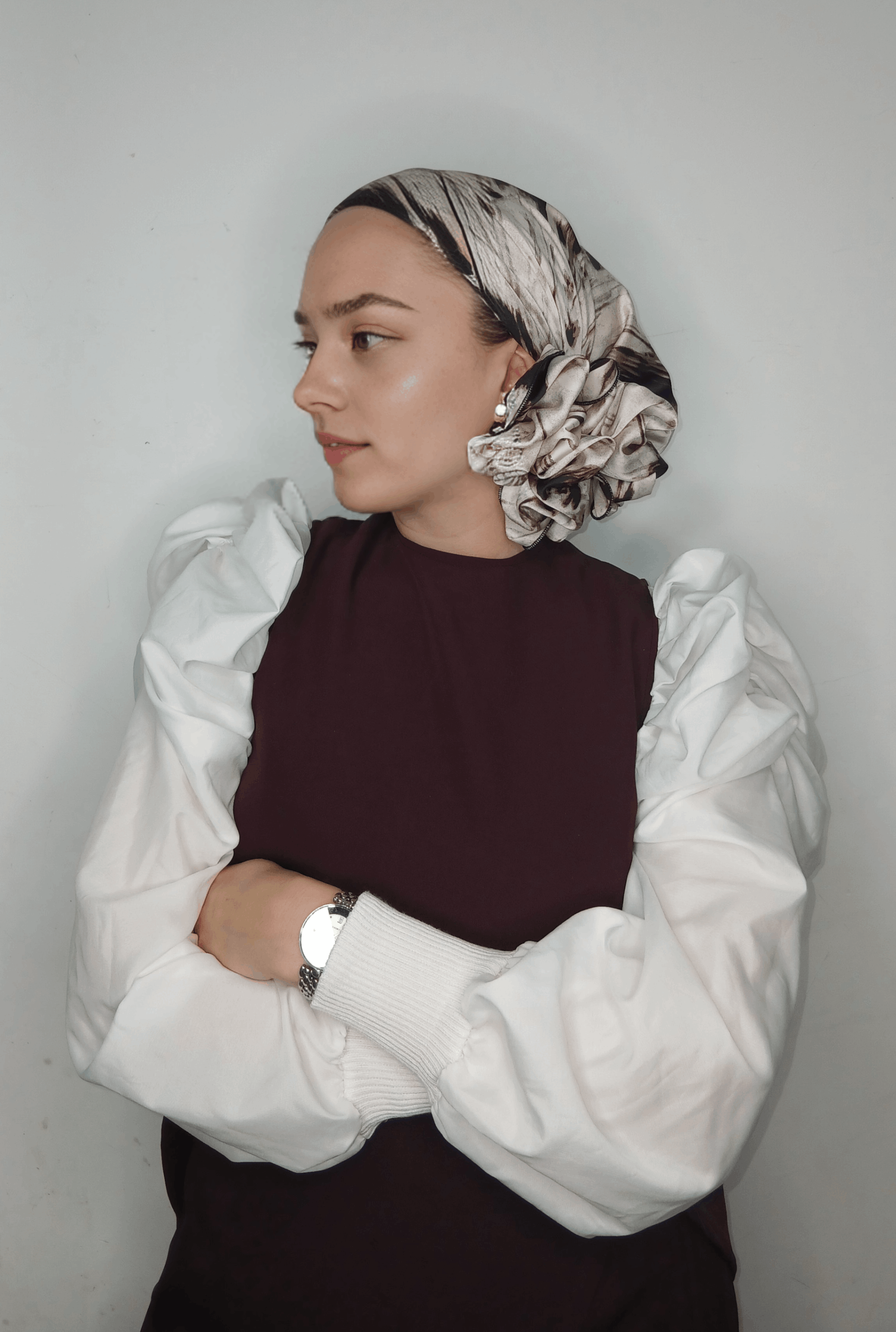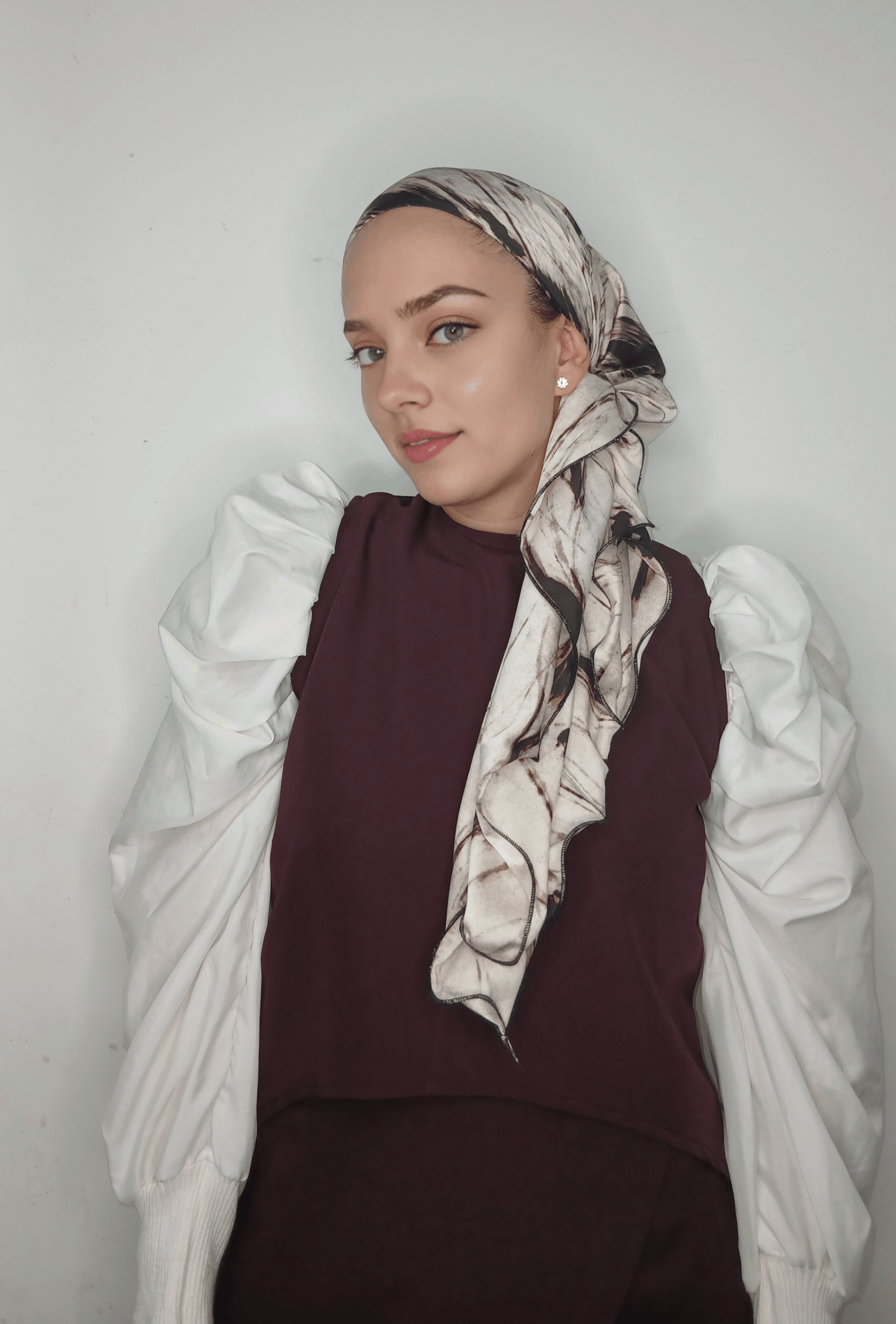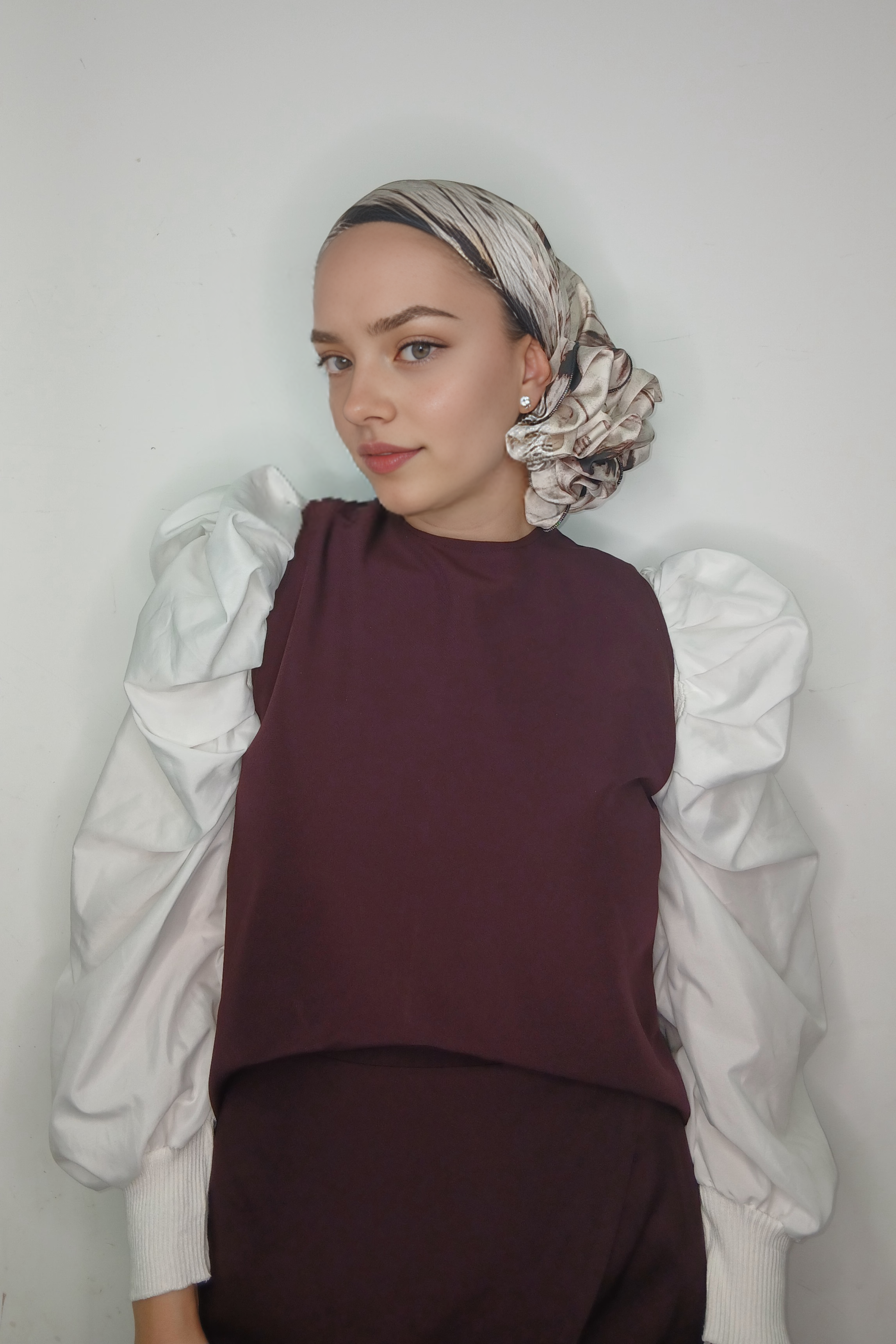 מטפחת סאטן בגווני בורדו כהה וורדרד עם נגיעות שחור על רקע אפור