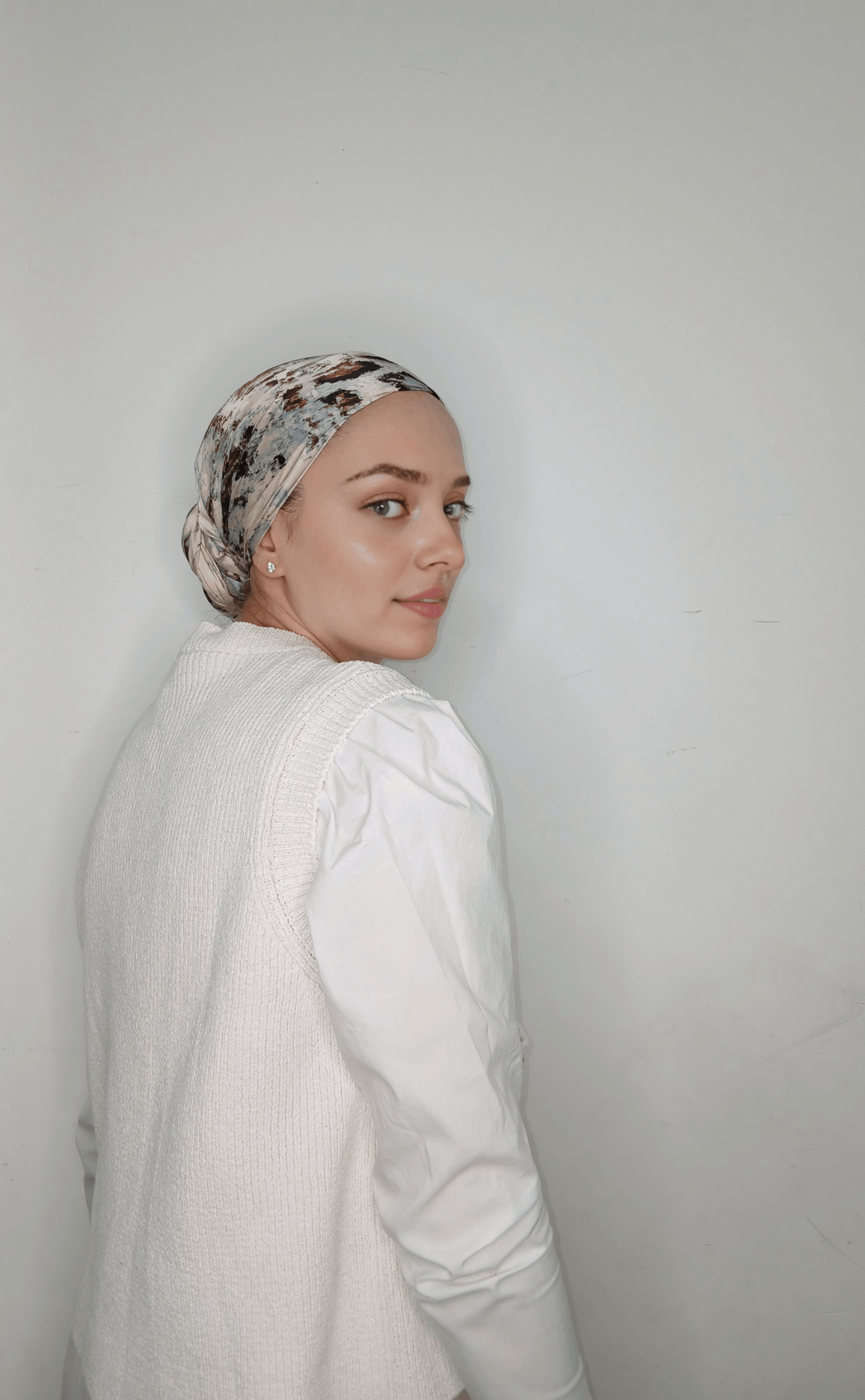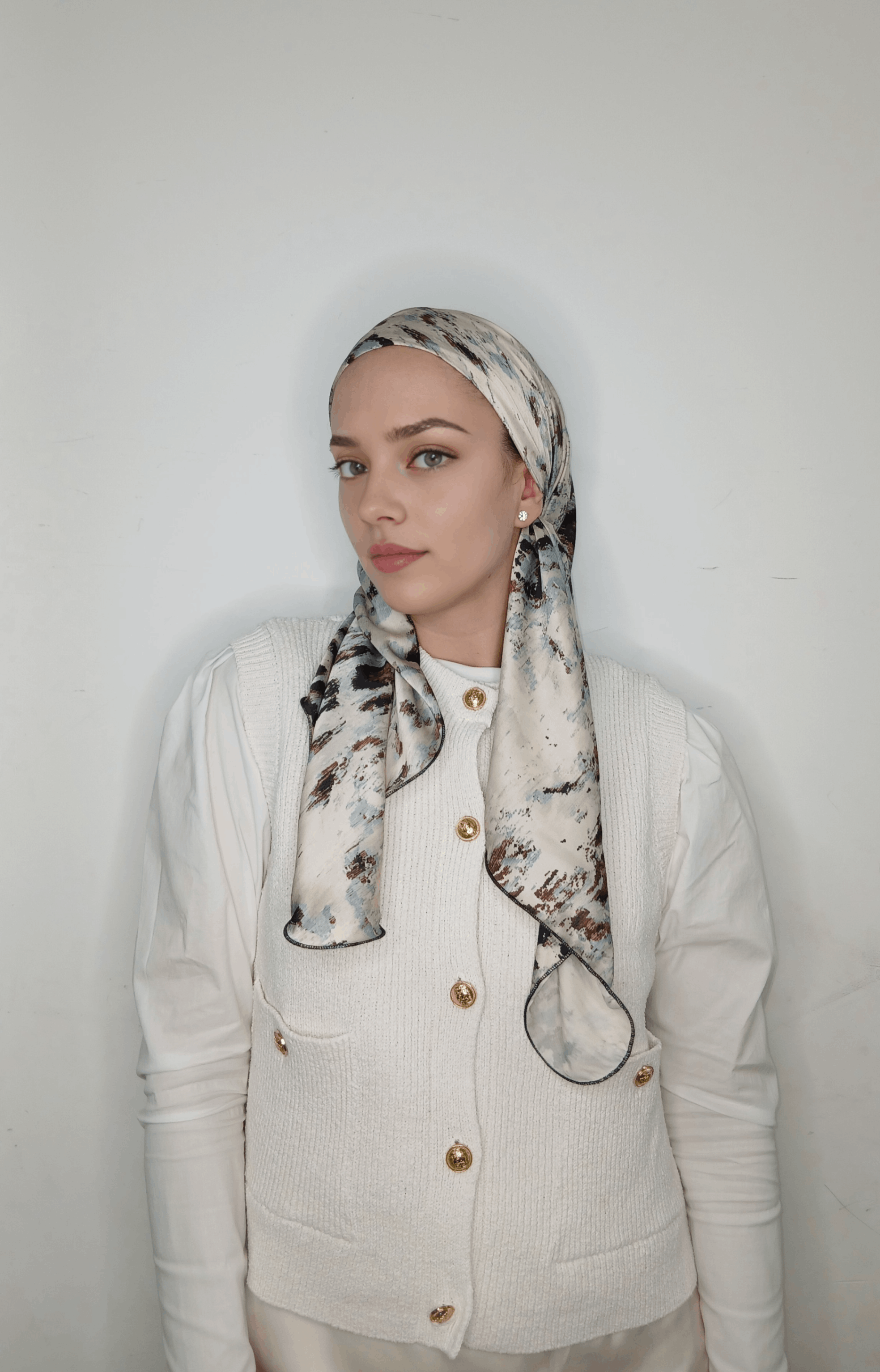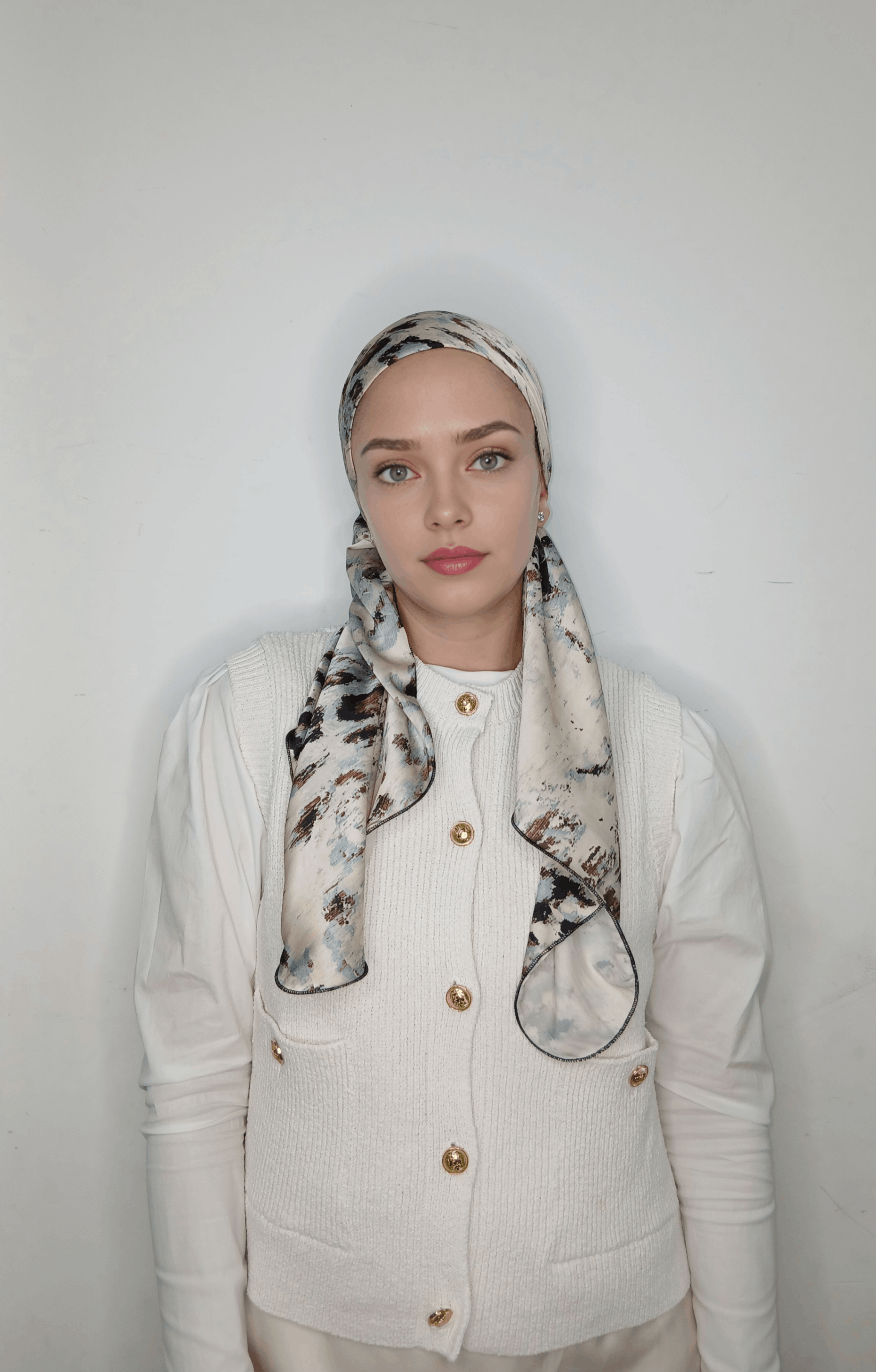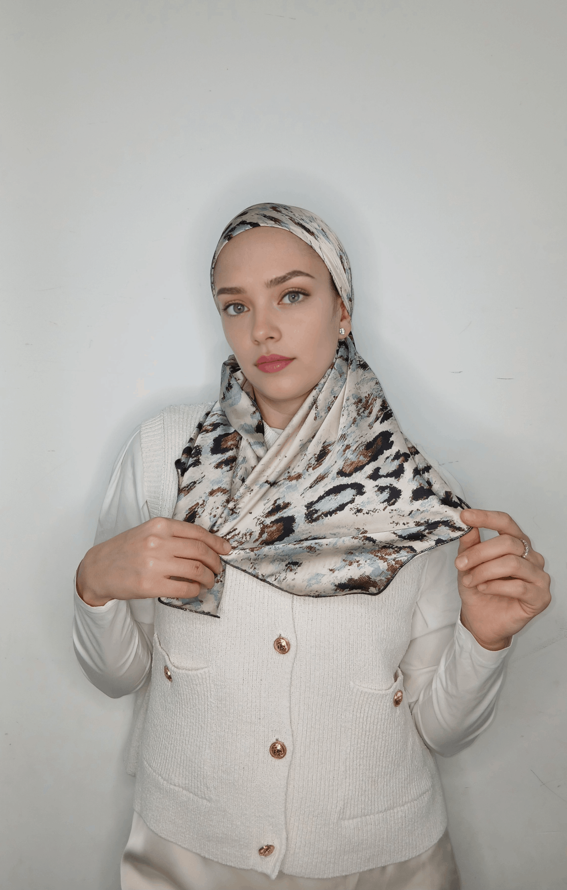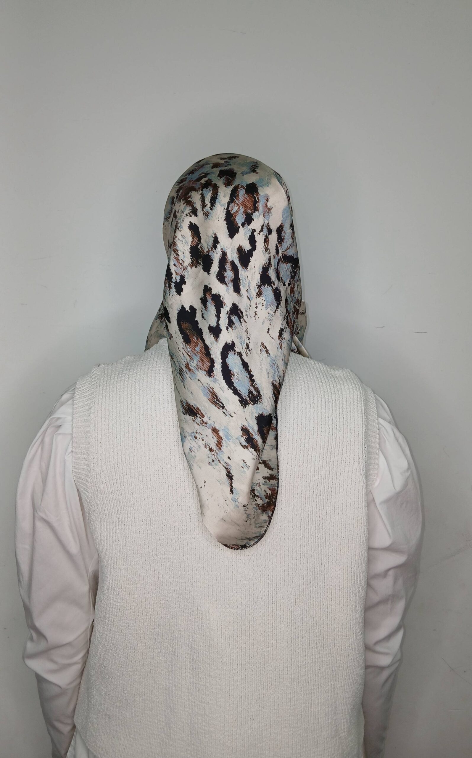 מטפחת סאטן בהדפס מנומר גווני תכלת שמנת וחום חמרה