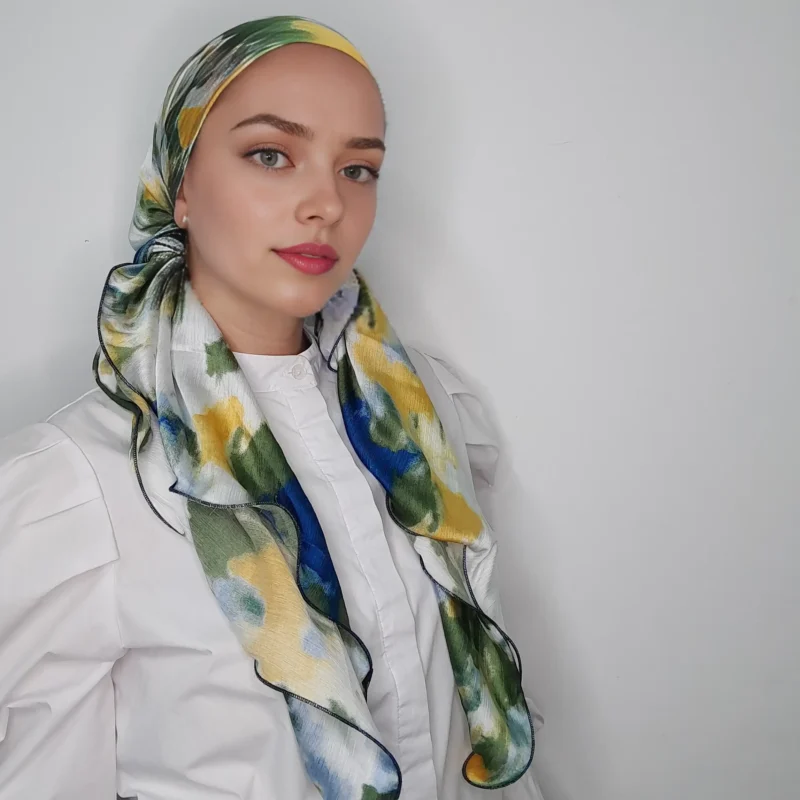 מטפחת סאטן בגווני ירוק , אפור כחול וצהוב , גוונים מדהימים , קשרת מושלם