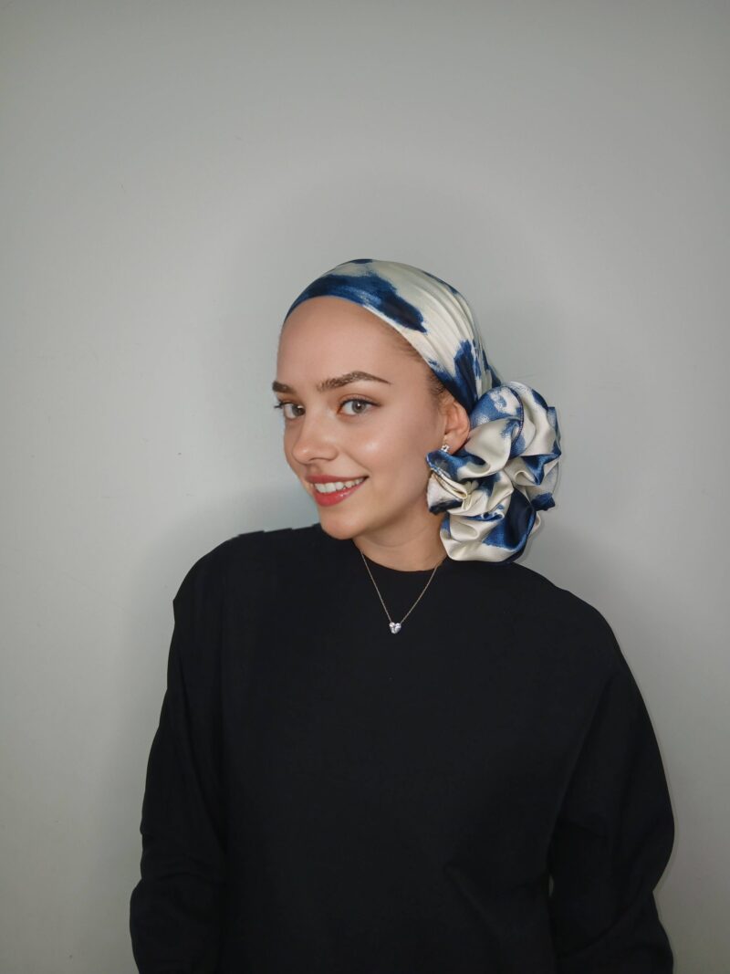 מטפחת קרפ סאטן בהדפס תאי דאי בגווני כחול ולבן