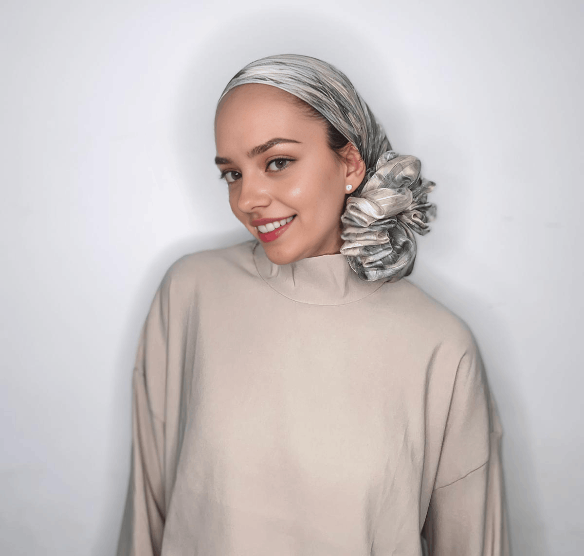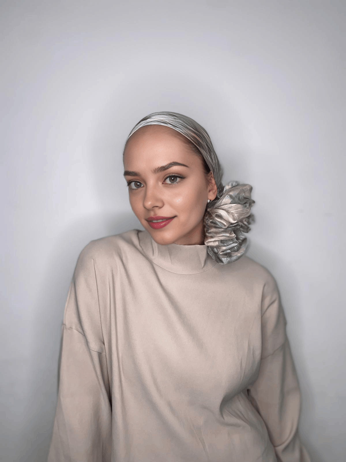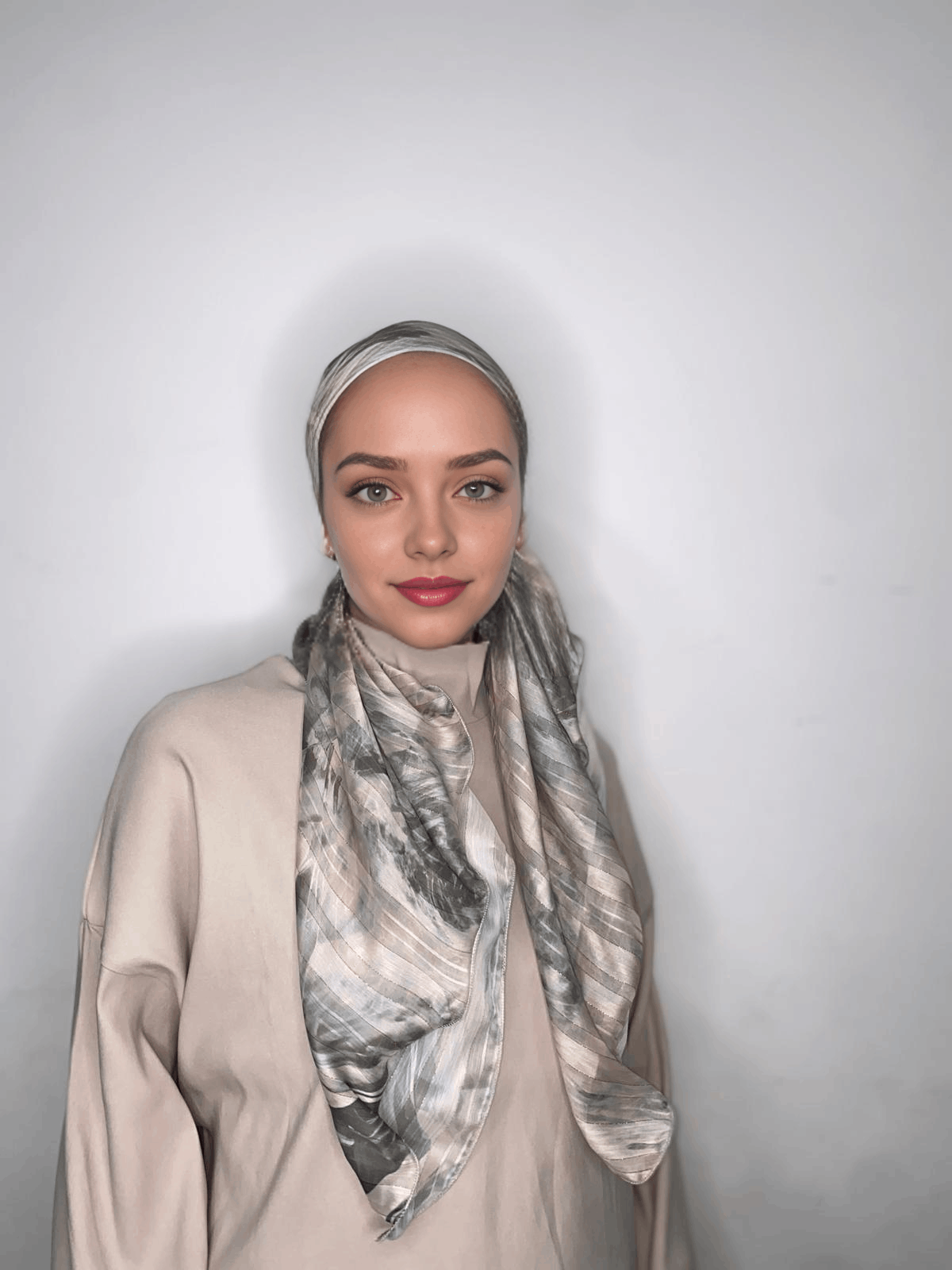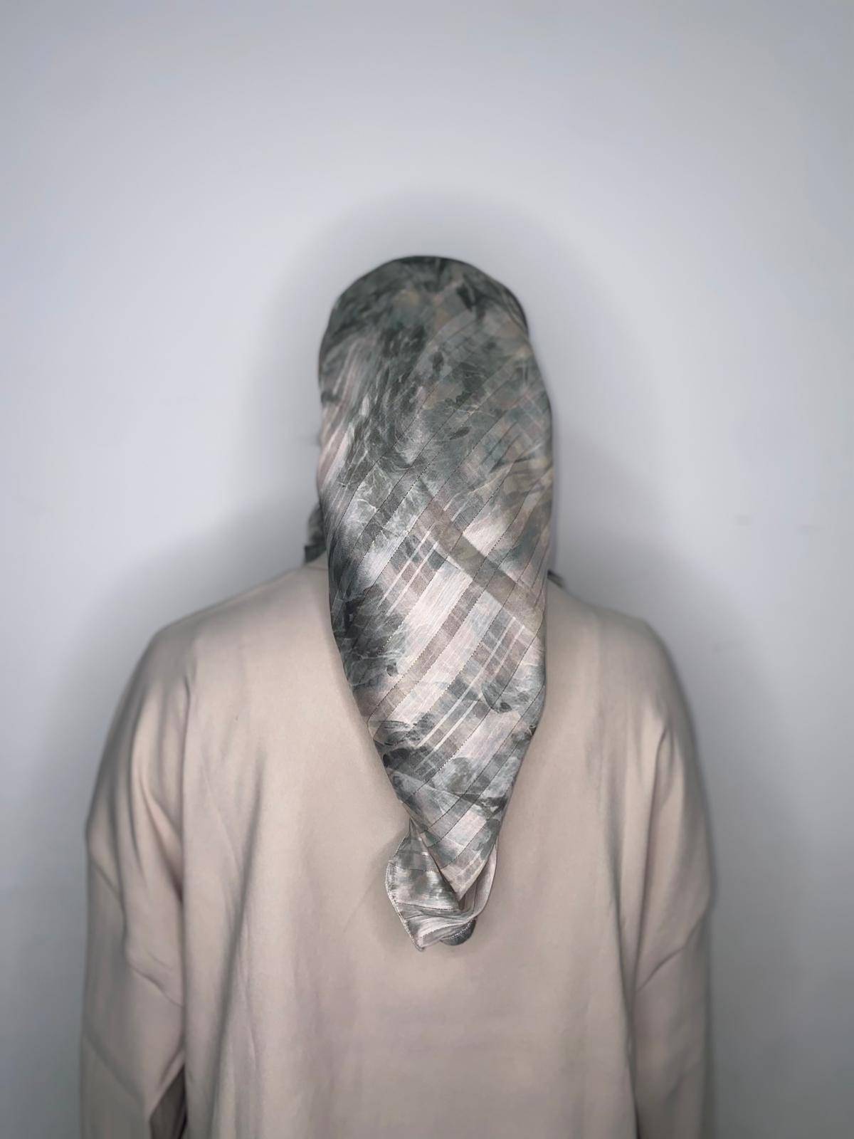 מטפחת שיפון בצבע אבן עם הדפס עדין בירוק לאורך המטפחת יש חוטי זהב נוצצים