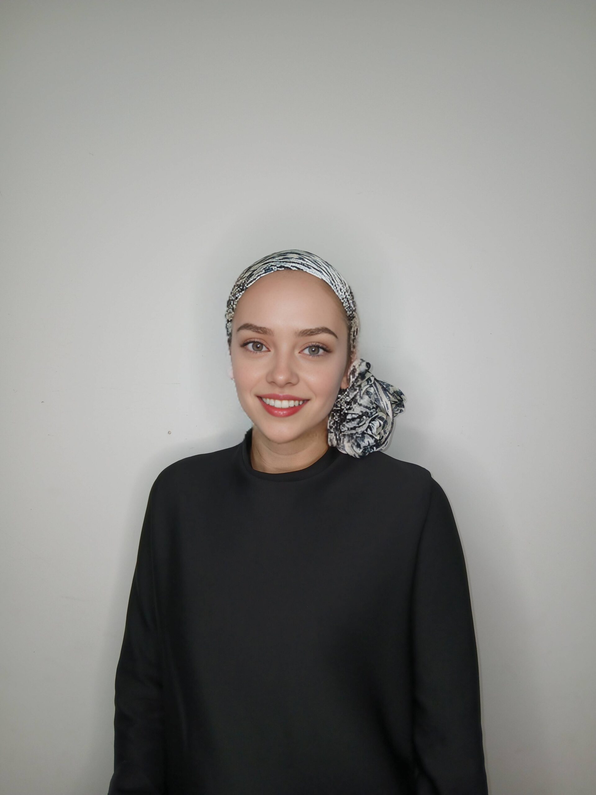 מטפחת קרפ סאטן בהדפס מיוחד בגווני לבן וטורקיז כהה