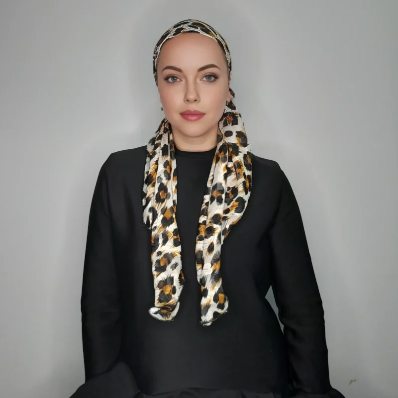 מטפחת שיפון חגיגית , בהדפס מנומר על גווני חום שחור עם כתמים מבריקים מיוחדים