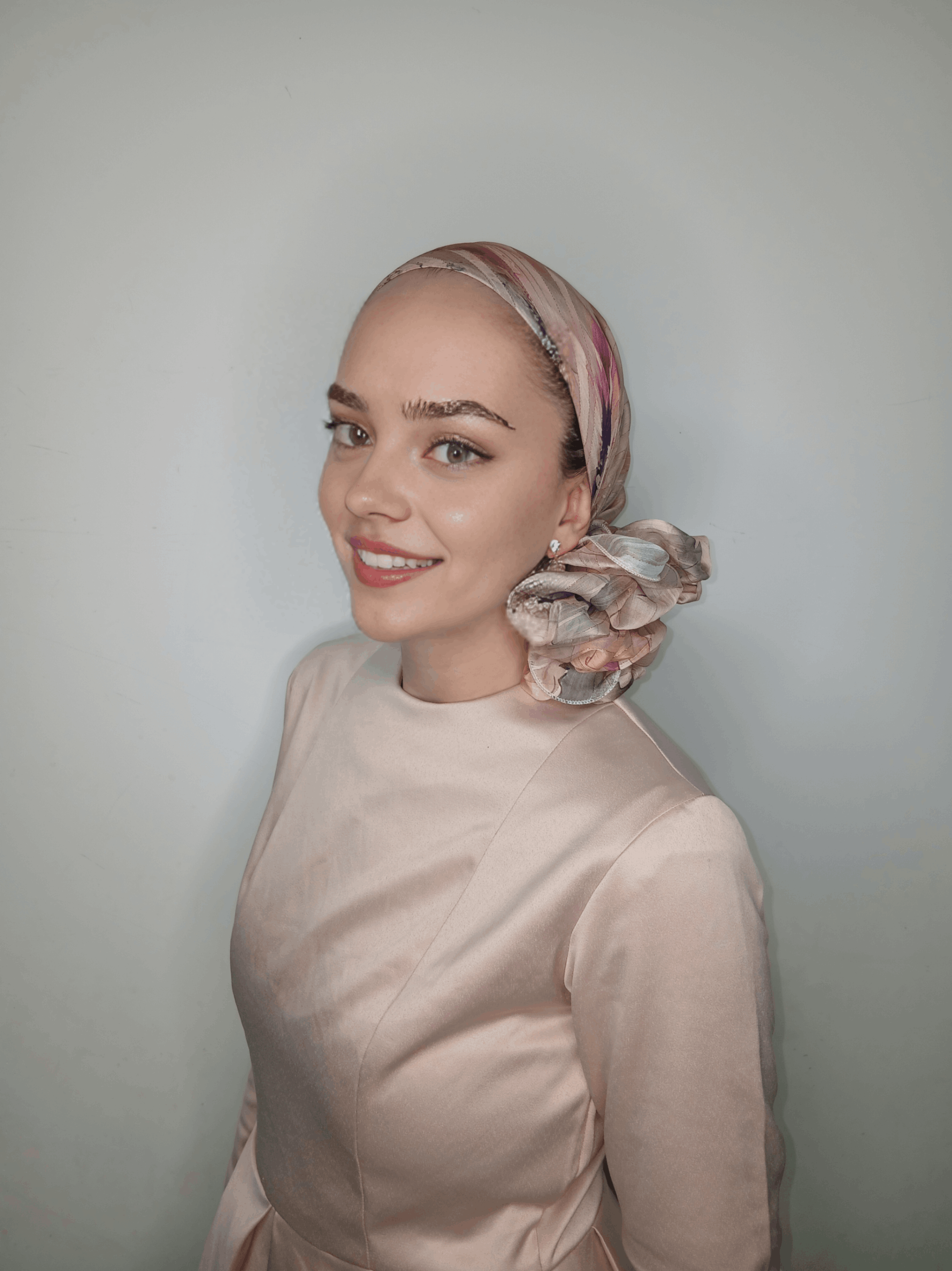 מטפחת שיפון חגיגית בגווני וורוד בהדפס פרחוני עדין עם פסים נוצצים לאורך המטפחת